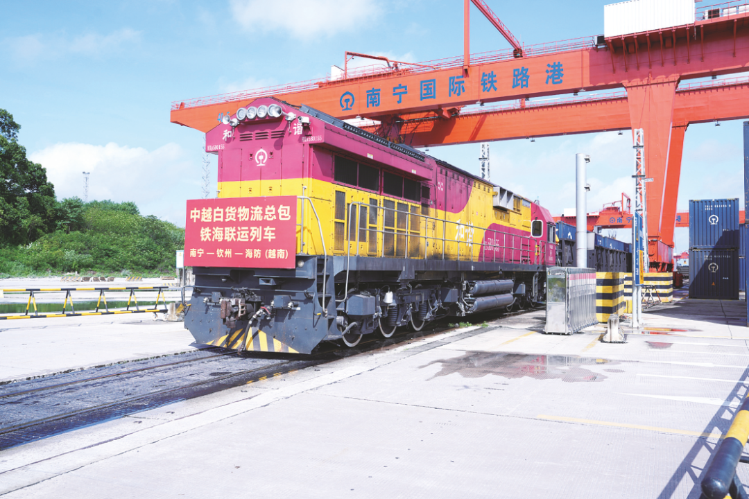 南宁片区率先推出全国首创的“聊天式”企业登记服务。市民可在中国(广西)自贸试验区南宁片区综合服务大厅享受到更智能、更高效的全新办事体验。 (五象新区管委会供图) 近年来,五象新区全力以赴推进“两港一区”建设,不断培育壮大跨境产业。做大做强临空物流,培育壮大临空服务,推动中越跨境班列持续、稳定运营,推进南宁国际铁路港、公路港、空港协同发展,不断提升多式联运水平。 在南宁国际铁路港,巨大的龙门吊将一个个集装箱吊装上车,随后通过中越班列运往河内安员站。据国铁南宁局公布数据,2025年广西始发中越班列累计发送出口货物3.7万标箱、同比增长86%,创历史新高。